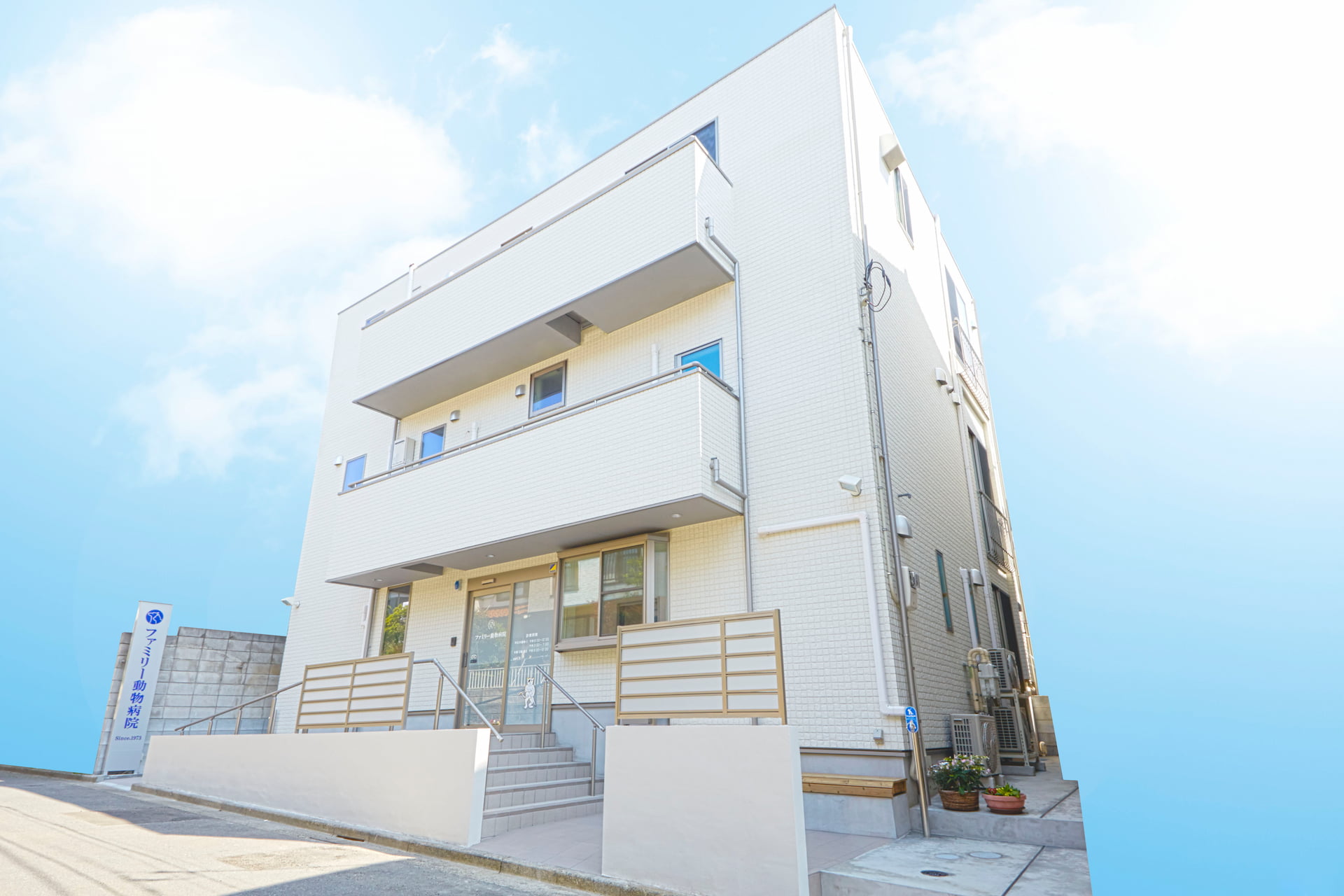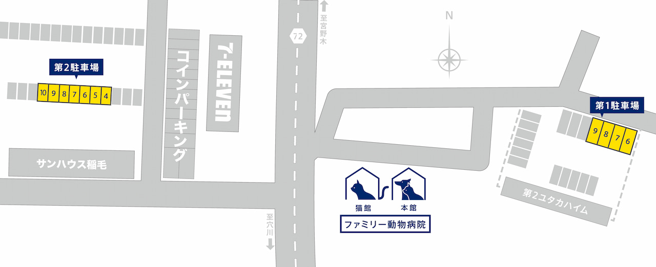 当院には本館(犬・猫)と、隣接する猫専用病棟がございます。カルテや検査データ、スタッフは共通ですので、どちらでも同様の医療を提供致しております。どちらの建物も同一敷地内にございまして、駐車場は共通となっております。