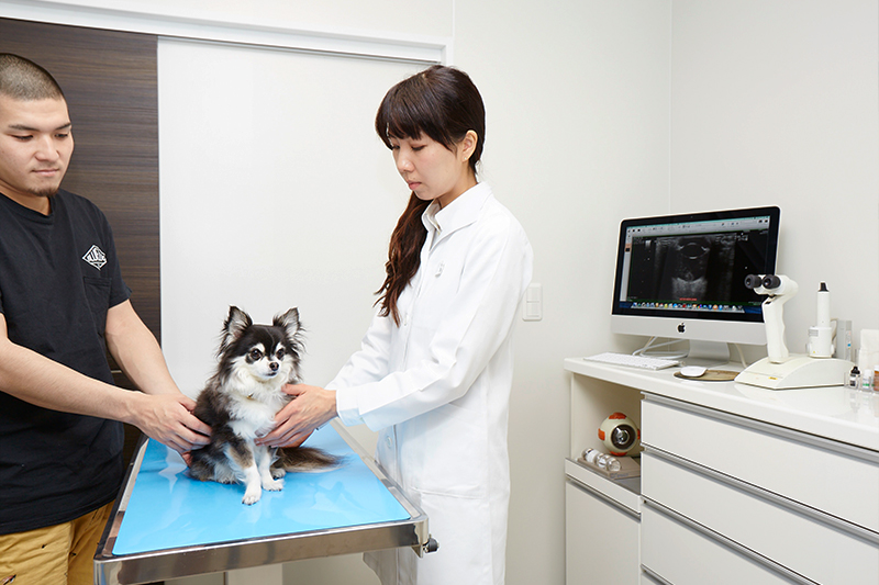 まず問診や、聴診・触診などの一般身体検査を行い、検査や治療の方向性を相談します。爪切りや肛門嚢絞りなどの処置も診察室で行います。