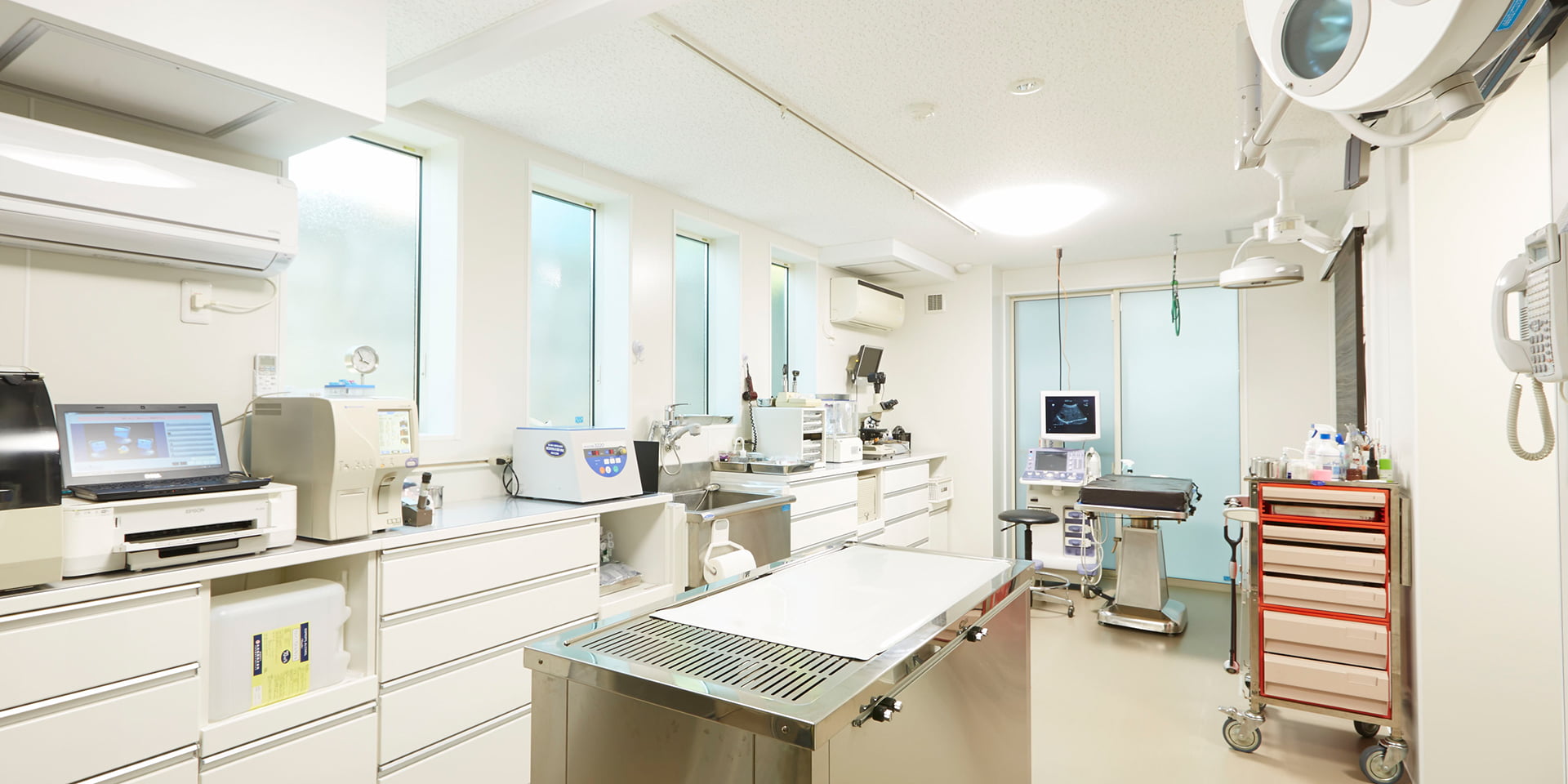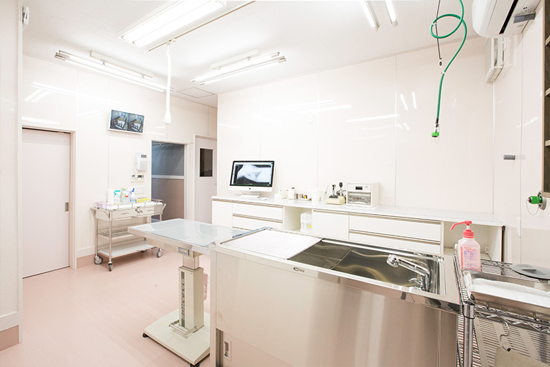 血液検査や糞便検査、尿検査などの各種検査を行うほか、薬浴(薬用シャンプー)、局所麻酔による縫合などの様々な処置(治療)を行います。超音波検査も処置室で行いますが、できるだけご家族に立ち会っていただくようにしています。